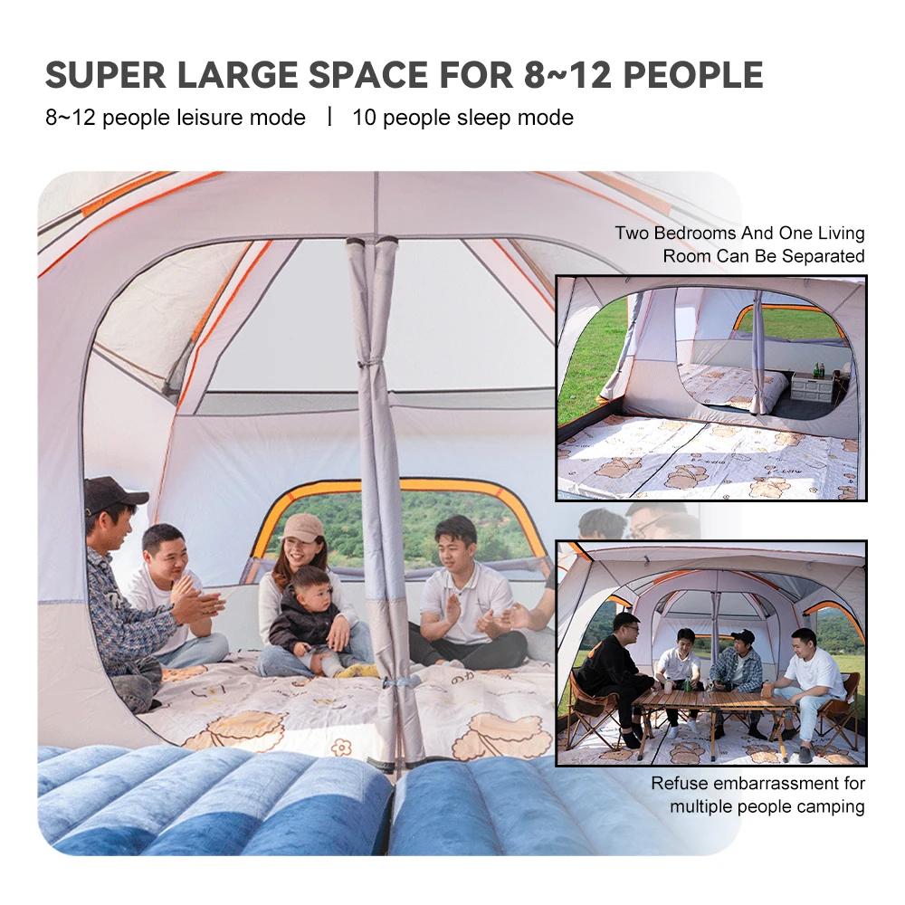 Tente familiale de camping (4 à 12 personnes) est conçue pour accueillir confortablement votre tribu lors de vos escapades en pleine nature. Spacieuse et robuste, elle offre un abri sécurisé pour créer des souvenirs inoubliables en famille ou entre amis, avec une capacité d’accueil adaptée à tous les groupes. Sa conception intuitive garantit un montage rapide pour que vous puissiez profiter pleinement de votre séjour dès votre arrivée sur le site de camping.